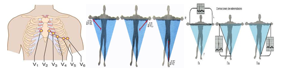 Derivações: representam a localização anatômica que está sendo apresentada no traçado do ECG, padronizada em precordiais (v1; v2; v3; v4; v5 e v6) e periféricas (DI; DII; DIII; aVR; aVL e aVF).
