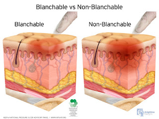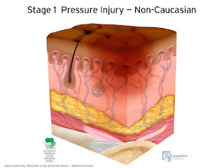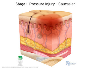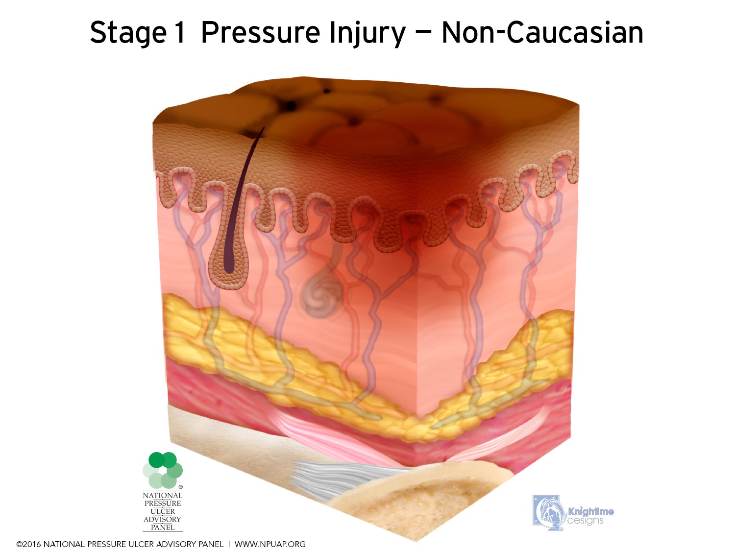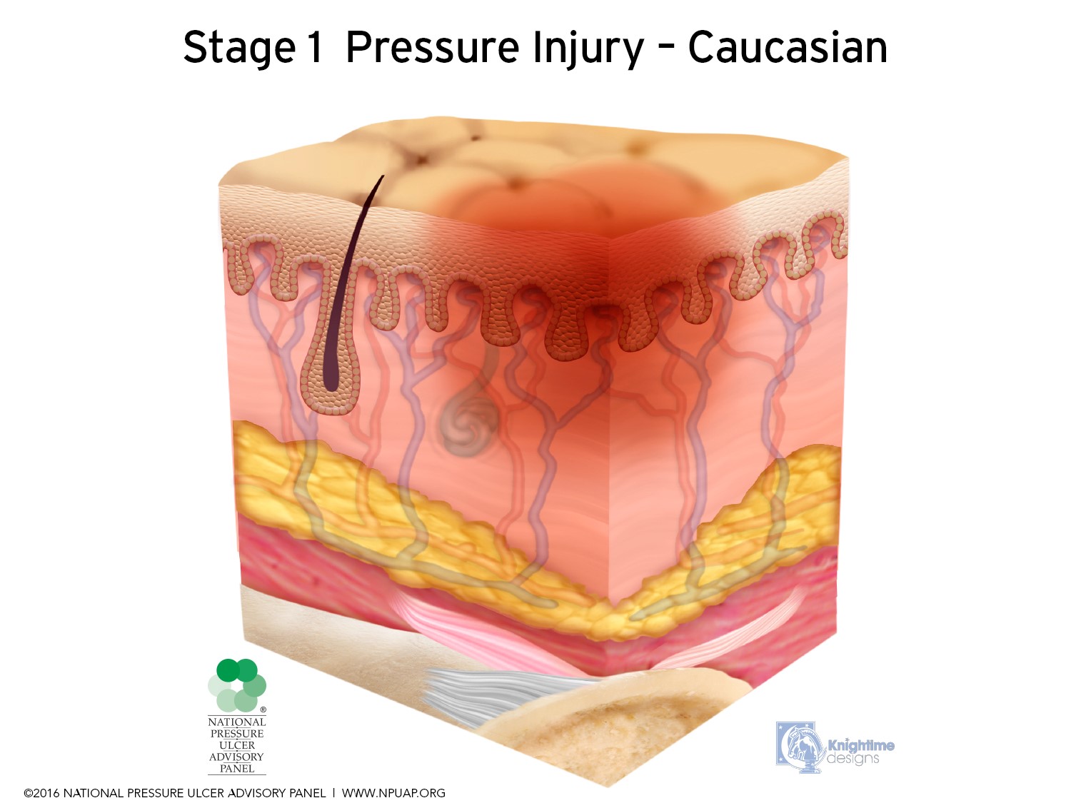 Pele intacta com vermelhidão não branqueável, de uma área localizada normalmente sobre uma proeminência óssea. Peles escuras podem não ter branqueamento visível; a sua cor pode diferir da área circundante. A área pode ser dolorosa, firme, suave, mais quente ou mais fria comparativamente ao tecido adjacente. Categoria / Estágio I pode ser difícil de detectar em indivíduos com tons de pele escura. Pode indicar “em risco” indivíduos (um sinal anunciador de risco).
