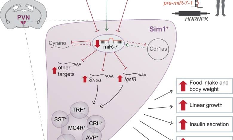 O papel do miR-7 em neurônios Sim1 para regular a homeostase energética de mamíferos e a função neuroendócrina. Em camundongos, a expressão hipotalâmica de miR-7 é regulada pelo estado metabólico. Em humanos, variantes no locus que engloba miR-7 estão associadas à expressão reduzida de HNRNPK/MIR-7-1. O miR-7 regula a expressão dos RNAs não codificantes Cyrano e Cdr1as (linhas tracejadas indicam dados publicados anteriormente). A perda da expressão de miR-7 em neurônios Sim1 leva à regulação positiva de genes alvo de miR-7, incluindo Snca e Igsf8, para interromper a função de várias subpopulações de neurônios Sim1. Como resultado, a ausência de miR-7 causa obesidade hiperfágica, aumento do crescimento linear, aumento da secreção de insulina, aumento da ingestão de líquidos e função do eixo HPA suprimida. As setas verdes indicam um efeito positivo na expressão; linhas pontiagudas vermelhas indicam um efeito negativo na expressão. Crédito: Comunicações da Natureza (2022). DOI: 10.1038/s41467-022-33367-w