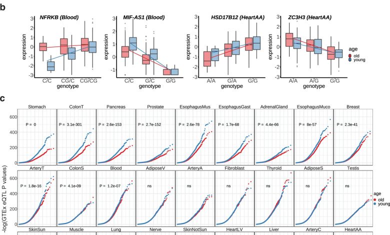 A idade afeta o poder preditivo dos eQTLs em muitos tecidos. Crédito: Comunicações da Natureza (2022). DOI: 10.1038/s41467-022-33509-0