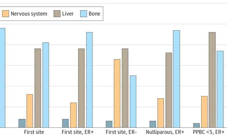Locais de metástase por status do receptor de estrogênio (ER) e tempo desde o nascimento recente Grupo. As análises incluíram um total de 1.787 locais de metástase conhecidos (incluindo vários locais de metástase por pessoa de 396 pacientes), 387 pacientes com primeiro local de metástase conhecido, 282 pacientes com doença ER-positivo (ER+), 88 pacientes com ER-negativo (ER- ), 77 pacientes nulíparas com doença ER+, 83 pacientes com doença ER+ diagnosticada em menos de 5 anos após o parto (PPBC JAMA Network Open (2022). DOI: 10.1001/jamanetworkopen.2022.36763