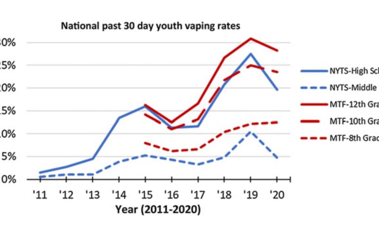 Porcentagem de várias faixas etárias escolares que fumaram nos últimos 30 dias. As linhas azuis indicam dados do NYTS (51, 52, 54–60), e as linhas vermelhas indicam dados da pesquisa MTF (53). MTF, Monitorando o Futuro; NYTS, Pesquisa Nacional de Uso de Tabaco para Jovens. Crédito: Pesquisa clínica do câncer (2022). DOI: 10.1158/1078-0432.CCR-22-2429
