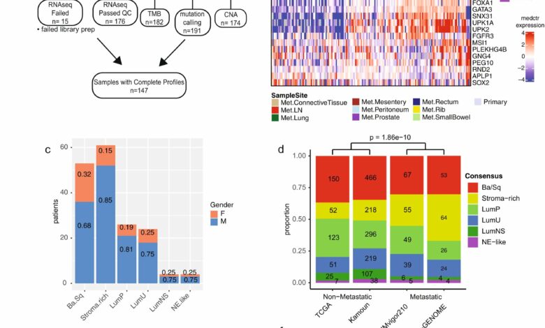 O desenho do estudo UC-GENOME e a subtipagem molecular mostram enriquecimento de tumores primários ricos em estroma em conjuntos de dados metastáticos. Crédito: Natureza Comunicações (2022). DOI: 10.1038/s41467-022-33980-9