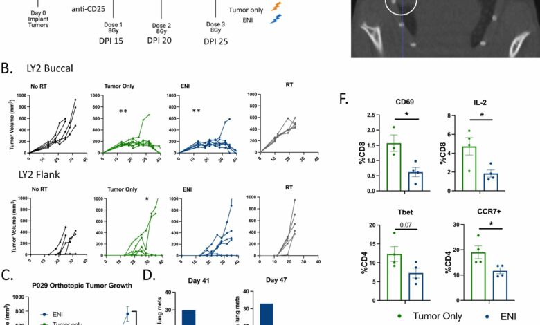 ENI elimina a resposta imune à combinação de radiação e imunoterapia. Um esquema do projeto experimental para irradiação tumoral macroscópica com ou sem irradiação nodal eletiva (ENI). Os camundongos foram implantados tanto na boca quanto no flanco no dia 0 pós-implantação (DPI). A irradiação corporal estereotáxica (SBRT) foi administrada quando os tumores atingiram ~ 150 mm3 e o anti-CD25 foi administrado um dia antes da SBRT. Criado com BioRender.com. B Curvas de crescimento tumoral, do experimento representado em (A), tumor bucal (topo) e curvas de crescimento tumoral de flanco (parte inferior) para camundongos tratados com anti-CD25 (n = 5), anti-CD25 e tumor apenas SBRT (n = 7), anti-CD25 e ENI (n = 7) e tumor apenas SBRT sozinho (n = 5). C Curvas de crescimento tumoral bucal para camundongos implantados com a linha celular P029 (n = 10 por grupo). Os camundongos foram implantados na boca no dia 0 pós-implantação (DPI). O SBRT foi administrado quando os tumores atingiram ~150 mm3 e o anti-CD25 foi administrado um dia antes do SBRT e uma vez por semana depois disso. As doses de SBRT foram espaçadas por 4-5 dias. D Quantificação da porcentagem de camundongos com tumores P029 que tinham metástases pulmonares detectáveis radiograficamente nos dias 41 (ENI, n = 10; apenas tumor, n = 7) e 47 (ENI, n = 9; apenas tumor, n = 7) após – implantação de células tumorais. As metástases pulmonares foram avaliadas por imagens de microCT. Imagem microCT representativa de EA de uma metástase pulmonar identificada em um camundongo tratado com ENI no modelo P029. Uma metástase é destacada com um círculo branco. F Análise de citometria de fluxo de sangue retirado de camundongos no dia 24 DPI no experimento representado em (A) (ENI, n = 4; apenas tumor, n = 4). As células T CD8 foram definidas como CD45+CD3+CD8+ e as células T CD4 foram definidas como CD45+CD3+CD4+. Para o crescimento do tumor em diferentes pontos de tempo, 3 ou mais diferenças de grupos foram determinadas por um teste One-Way ANOVA com comparações post hoc de Tukey, com apenas 2 grupos foi usado um Two-Way ANOVA. Para testar se existe uma diferença entre os grupos de tratamento apenas com tumor SBRT e ENI na redução do número de camundongos que desenvolveram tumores no flanco, usamos um teste Exato de Fischer. Para a análise por citometria de fluxo, foi utilizado o teste t de Student bicaudal. A significância foi determinada se o valor p fosse Nature Communications (2022). DOI: 10.1038/s41467-022-34676-w