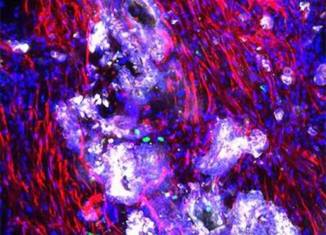 Imagem confocal de uma fatia de tecido vivo derivada de um tumor de paciente com câncer de apêndice metastático (carcinomatose peritoneal mucinosa). A imunofluorescência revela a presença de células cancerosas (branco), fibroblastos (vermelho) e células imunes (verde). Os núcleos celulares estão marcados em azul. Crédito: Jonathan Weitz, UC San Diego Health