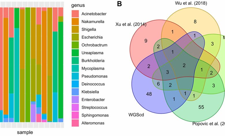 Taxa de bactérias mais abundante encontrada na análise da bexiga. Em (A), abundância relativa do gênero entre as amostras. Em (B), diagrama de Venn de presença/ausência: perfil metagenômico de tecido de câncer de bexiga obtido de dados capturados de sequenciamento genômico total (WGScd) em comparação com pesquisa de literatura de perfil metagenômico de câncer de bexiga de urina obtido de amplicon de rRNA 16s de sequenciamento. Os dados do táxon foram convertidos para gênero, pois nem todos os trabalhos apresentam resultados na resolução de espécies. Crédito: Oncoalvo (2022). DOI: 10.18632/oncotarget.28308