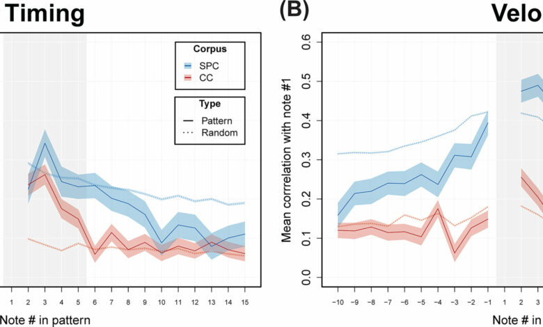 Gráficos de linha representando as correlações médias dos valores de tempo (A) e velocidade MIDI (B) entre a primeira e a segunda, a primeira e a terceira, a primeira e a quarta e a primeira e a quinta notas nos padrões de 5 notas nas 10 a 20 ocorrências de cada padrão no Single-Player Corpus (SPC, azul) e no Control Corpus (CC, vermelho). Para iluminar o contexto em que esses padrões ocorrem, os valores de correlação da primeira nota no padrão com as 10 notas (variáveis) anteriores e as 10 notas (variáveis) seguintes aos padrões de 5 notas também estão incluídos. Correlações para padrões que ocorrem de 10 a 20 vezes no corpus relevante (linhas sólidas) são plotadas ao longo de correlações de linha de base (linhas pontilhadas) derivadas de 10.000 amostras de 20 sequências de 5 notas selecionadas aleatoriamente. As áreas sombreadas em azul e vermelho correspondem aos erros padrão da média, e a caixa cinza indica a extensão dos padrões de 5 notas (reais ou simulados). As correlações para a primeira nota no padrão foram omitidas, pois todos os valores (autocorrelação) seriam iguais a 1. (Para interpretação das referências a cores nesta legenda da figura, o leitor deve consultar a versão web deste artigo .). Crédito: Conhecimento (2022). DOI: 10.1016/j.cognição.2022.105308