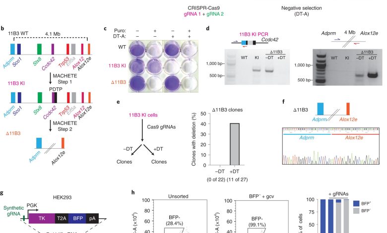 MACHETE permite a engenharia eficiente de deleções genômicas. a, Esquema da abordagem MACHETE. WT, tipo selvagem; HA, braço de homologia; Puro, puromicina; pA, sinal de poliadenilação. b, Esquema de engenharia mediada por MACHETE de uma deleção de 4,1 Mb no locus 11B3. c, coloração violeta de cristal de WT, células 11B3 KI e Δ11B3 NIH3T3 após seleção com Puro a 2 μg ml−1 e/ou DT-A a 50 ng ml−1. d, genotipagem de PCR para os alelos 11B3 KI e Δ11B3 nas linhas celulares NIH3T3 indicadas. e, Esboço experimental para testar o impacto da seleção negativa mediada por DT na eficiência da engenharia de deleção de Δ11B3 em células NIH3T3 (esquerda). Análise clonal de células NIH3T3 manipuladas sem (−DT) e com (+DT) seleção de DT (direita). f, sequenciação Sanger do ponto de interrupção de deleção de 11B3 confirmando a deleção esperada. g, Esquema de engenharia mediada por MACHETE de uma deleção de 45 Mb no locus 7q11-22 em células HEK293. gcv, ganciclovir. h, gráficos de citometria de fluxo e quantificação de BFP+ e BFP−células HEK293 nas condições indicadas. i, genotipagem de PCR para os alelos 7q11 KI e Δ7q11-22 em células HEK293 sob as condições indicadas.+. Crédito: Natureza Câncer (2022). DOI: 10.1038/s43018-022-00443-5