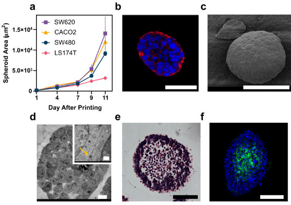 Características dos esferóides tumorais bioimpressos. (a) Crescimento de todas as quatro linhas de células cancerosas (rosa: LS174T, roxo: SW620, azul: SW480, amarelo: CACO2), medido 7, 9 e 11 d após a bioimpressão. (b) Imagem de microscopia confocal através do centro de um esferóide SW620. Vermelho = actina (TRITC-faloidina), azul = núcleos celulares (DAPI). Barra de escala = 50 μm. (c) Microscopia eletrônica de varredura de um esferóide tumoral SW620, barra de escala = 50 μm. (d) TEM de uma seção esferóide SW620, com junções célula-célula observadas (inserção, seta amarela). Barra de escala = 10 μm, barra de escala inserida = 500 nm. (e) Corte histológico de um esferóide SW620 embebido em parafina corado com hematoxilina e eosina. Barra de escala = 100 μm. (f) Corte histológico de um esferóide SW620 embebido em parafina. Verde = região hipóxica (HypoxyProbe), azul = núcleos celulares (DAPI). Barra de escala = 100 μm. Crédito: Biofabricação (2022). DOI: 10.1088/1758-5090/ac999f