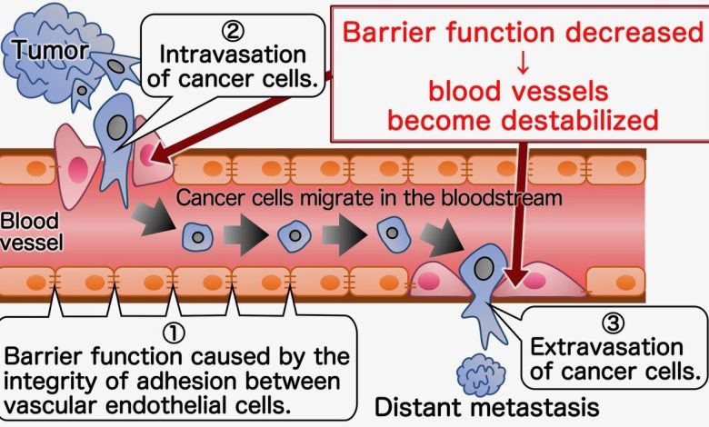 Normalmente, os vasos sanguíneos são estabilizados e sua função de barreira é mantida pela forte adesão entre as células endoteliais vasculares (①). Quando as células cancerosas metastatizam para órgãos distantes através dos vasos sanguíneos, a morfologia das células endoteliais vasculares muda em resposta aos fatores de crescimento ou citocinas secretadas pelas células cancerígenas. Isso resulta na perda de adesão entre o endotélio vascular, desestabilização dos vasos e perda de sua função de barreira. Essas mudanças facilitam a invasão, “intravasamento” (②) de células cancerosas nos vasos sanguíneos e permitem que as células cancerosas viajem pelo corpo na corrente sanguínea. Quando as células cancerosas atingem os órgãos distantes, elas migram para fora dos vasos sanguíneos em um processo chamado “extravasamento” (③) induzindo desestabilização vascular, seguida pela formação de locais metastáticos distantes. Crédito: Departamento de Bioquímica, TMDU