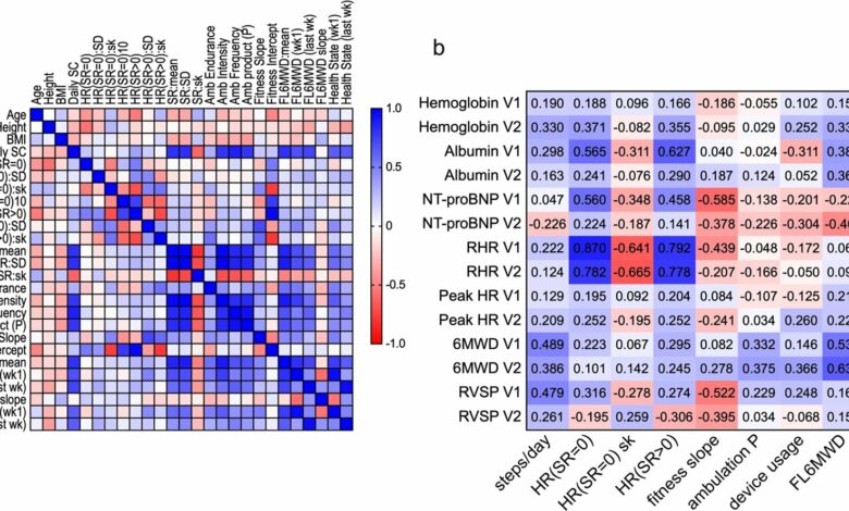 Correlação entre os parâmetros derivados do Fitbit e entre os parâmetros derivados do Fitbit e os parâmetros clínicos. uma Matriz de correlação (valor Pearson r) de todos os parâmetros derivados do Fitbit e variáveis demográficas (idade, altura e IMC). b Matriz de correlação (valor r de Pearson) para parâmetros clínicos contínuos estatisticamente significativos (eixo y) para subgrupos identificados a partir dos parâmetros Fitbit (eixo x). Crédito: npj medicina digital (2022). DOI: 10.1038/s41746-022-00696-5