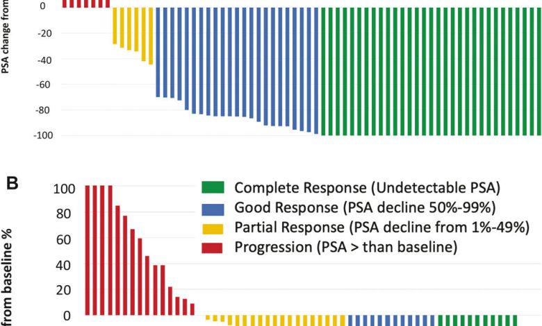 A, Gráfico em cascata do antígeno específico da próstata (PSA) para terapia direcionada à metástase cirúrgica. B, gráfico em cascata de PSA para terapia de metástase de radioterapia corporal estereotáxica. Crédito: Revista de Urologia (2022). DOI: 10.1097/JU.0000000000002898