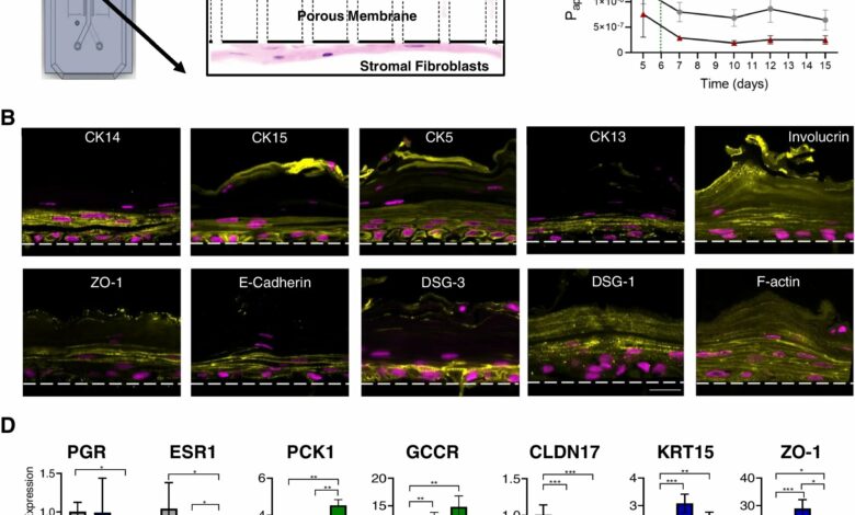 Caracterização de um modelo microfluídico de vagina humana em um chip. UMA Um diagrama de um chip de órgão de dois canais visto de cima (esquerda) e uma micrografia de maior ampliação através de uma seção transversal de um chip de vagina mostrando células epiteliais vaginais humanas estratificadas cultivadas no canal superior sobre uma membrana porosa de 50 μm de espessura (tracejado as linhas indicam a superfície superior e inferior) com fibroblastos uterinos humanos cultivados no lado oposto da membrana no canal inferior (à direita). B Micrografias de imunofluorescência transversais representativas de chips de vagina humana mostrando epitélio vaginal estratificado escamoso imunocorado para CK14, CK15, CK5, CK13, Involucrin, ZO-1, E-caderina, DSG-3, DSG-1 e F-actina (para mostrar todas as células). Linha tracejada, limite superior da membrana porosa; amarelo, marcadores diferentes; magenta, núcleos corados com DAPI. C Um gráfico mostrando as mudanças na permeabilidade aparente (Paplicativo) da barreira de tecido vaginal medido no chip para dois doadores humanos 05328 (hispânico) e 04033 (caucasiano) medido pela quantificação do transporte Cascade Blue. Os dados são apresentados como média ± dp; n = 4. D Resultados de RT-qPCR mostrando expressão relativa de mRNA de ESR1, PGR, PCK1, GCGR, KRT15, CLDN17 e ZO-1 no chip da vagina antes (D0) e após a diferenciação no dia 10 na presença ou ausência de 0,4 nM (azul) ou 4 nM (verde) β-estradiol (D10). Crédito: microbioma (2022). DOI: 10.1186/s40168-022-01400-1