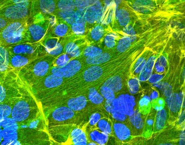 Células da placenta: As células isoladas de uma placenta formam uma camada densa. Núcleos celulares aparecem em azul nesta preparação corada, enquanto o andaime celular é verde. Crédito: Laboratórios Federais Suíços para Ciência e Tecnologia de Materiais