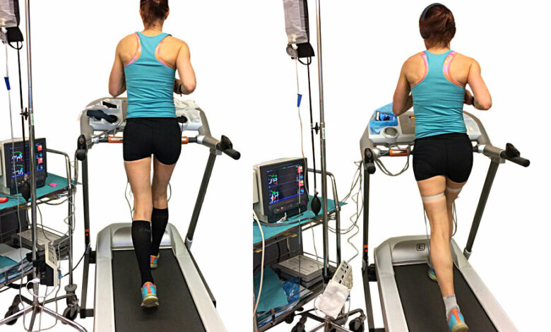 No estudo, 20 corredores experientes correram 10 quilômetros (aproximadamente 6,3 milhas) em uma esteira. O teste foi realizado em duas ocasiões, uma com meia de compressão e outra sem. Todos os corredores serviram assim como seus próprios controles. Durante a corrida, um cateter foi usado para registrar a pressão intramuscular no músculo frontal da perna e a oxigenação local no músculo foi medida por sensores na pele.