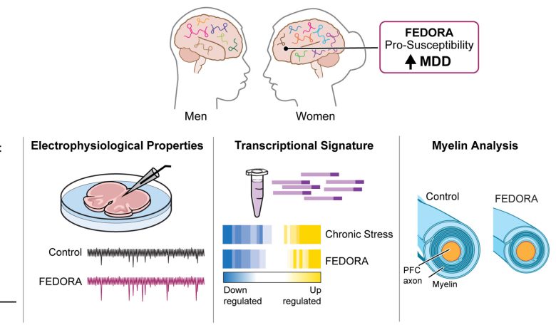 FEDORA é um gene de RNA que é regulado no cérebro de mulheres deprimidas, mas não de homens. Usamos modelos animais para demonstrar o mecanismo pelo qual ele age para promover o risco de depressão. Crédito: Issler et al., Nash Family Department of Neuroscience e Friedman Brain Institute, Icahn School of Medicine em Mount Sinai, NY