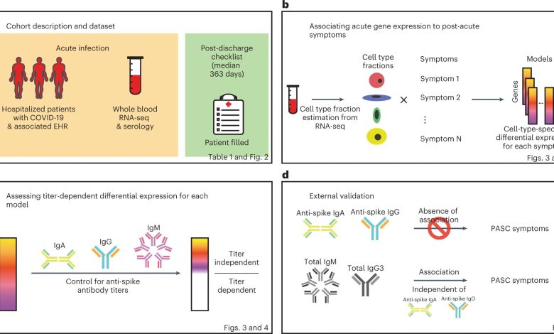 Fluxo de trabalho do estudo. Esquema do desenho do estudo, fluxo de trabalho de análise e validação. umaResumo da coorte estudada e dados coletados. bEstratégia para teste de expressão diferencial CTS para sintomas PASC. cEstratégia para distinguir DEGs se sua expressão diferencial depende ou não de títulos de anticorpos anti-pico. d, Estratégias de validação empregadas usando conjuntos de dados externos independentes. Crédito: Medicina da Natureza (2022). DOI: 10.1038/s41591-022-02107-4