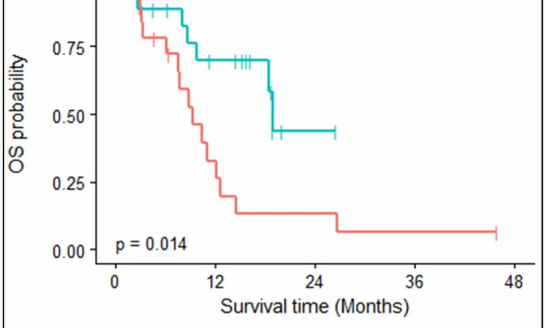 Foi utilizado o teste de log rank de sobrevida global; quinze dos 19 pacientes com alto GH morreram, o SG médio foi de 9,26 meses (95% CI: 7,59, 14,59). Crédito: 2022 Mohamed et al.