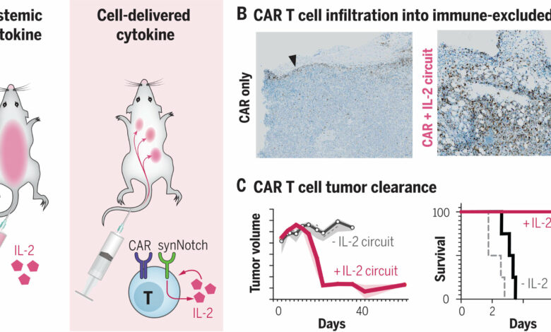 Greg M. Allen et al, Synthetic cytokine circuits that drive T cells into immuno-excluded tumors, Ciência (2022). DOI: 10.1126/science.aba1624
