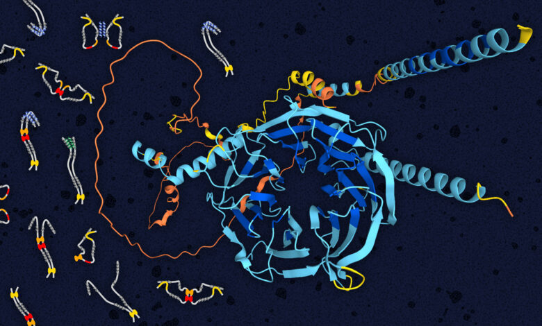 Estrutura da cadeia intermediária de dineína mostrando domínio de repetição WD dobrado no centro (azul) e domínio N-terminal desordenado (laranja). Ilustrados à esquerda estão vários modelos de estruturas abertas e fechadas do domínio desordenado (cinza) ligadas a cadeias leves (bolhas amarelas, vermelhas e laranja). Imagem fornecida por Elisar Barbar, OSU College of Science. Crédito: Elisar Barbar, estado de Oregon