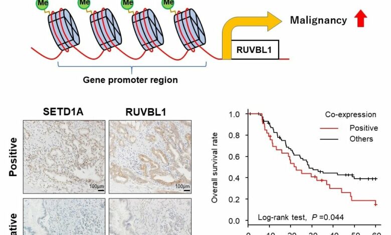 Trabalhos posteriores sugeriram que SETD1A pode metilar histonas perto do gene RUVBL1 e ativar sua expressão gênica. A redução da expressão de RUVBL1 em células PDAC teve efeitos biológicos semelhantes aos observados anteriormente com a interferência de SETD1A. “A análise das taxas de sobrevida revelou que os pacientes com PDAC com altos níveis de SETD1A e RUVBL1 tiveram pior sobrevida geral, sugerindo que sua co-expressão é um importante biomarcador prognóstico para esse câncer”, diz Takeshi Ishii.