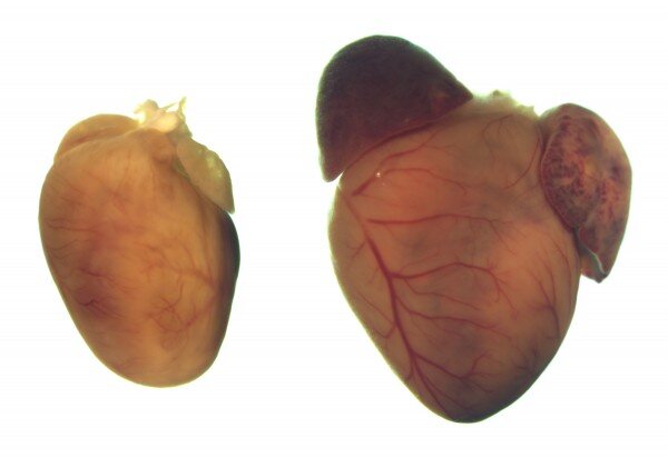 Esses corações representativos de camundongos de 12 semanas de idade mostram um coração normal (esquerda) e um coração aumentado que é característico de cardiomiopatia dilatada. Crédito: UT Southwestern Medical Center