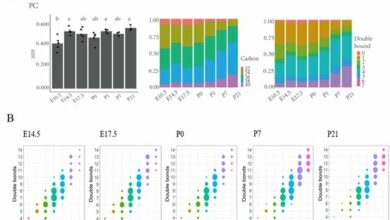 As principais características lipídicas da membrana durante o desenvolvimento do coração. (A) A distribuição de números de átomos de carbono…