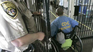 Um preso em cadeira de rodas passa por um posto de controle no California Medical Facility em Vacaville, Califórnia, em…
