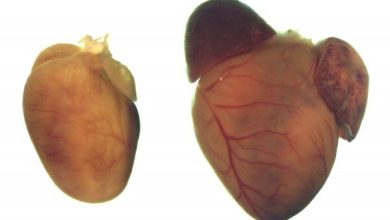 Esses corações representativos de camundongos de 12 semanas de idade mostram um coração normal (esquerda) e um coração aumentado que…