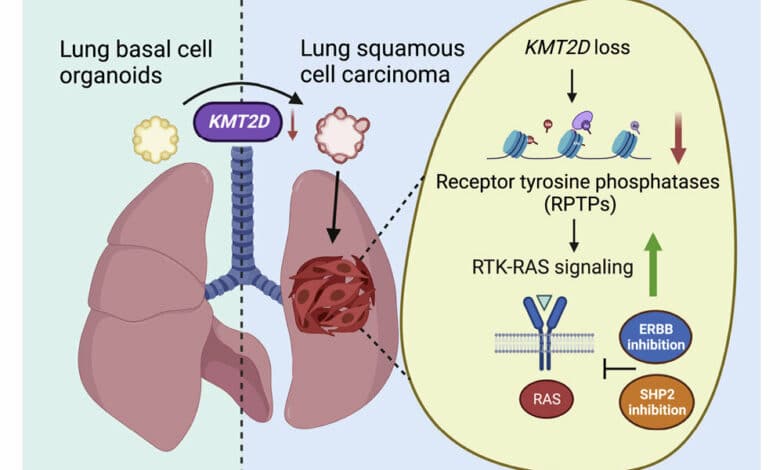 Atualmente, não há terapia de primeira linha aprovada e direcionada para o carcinoma escamoso do pulmão (LUSC), um câncer que se forma nas camadas celulares que revestem o órgão e é responsável por 20 a 30% das mortes por carcinoma do pulmão. Um novo estudo, publicado na Célula cancerosadescobriram que a exclusão de um gene chamado KMT2D fazia com que células pulmonares normais (basais) cultivadas em culturas complexas chamadas organoides se transformassem em células LUSC.