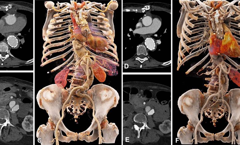 Comparação da qualidade da imagem entre EID CT com protocolo de meio de contraste padrão e PCD CT com protocolo de meio de contraste de baixo volume usando uma dose de radiação combinada. São mostradas imagens cinemáticas transversais e tridimensionais de CTA toracoabdominal em uma mulher de 71 anos no grupo 2. (A–C) Imagens de TC EID de terceira geração com seleção automatizada de tensão de tubo de 90 kVp. (D–F) Imagens de PCD CT com volume reduzido de meio de contraste de 52,5 mL e VMI a 50 keV. O intervalo de tempo entre os exames foi de 6 meses. CTA = angiografia por TC, EID = detector de integração de energia, PCD = detector de contagem de fótons, VMI = imagens monoenergéticas virtuais. Crédito: Radiologia: Imagem Cardiotorácica (2023). DOI: 10.1148/ryct.220140
