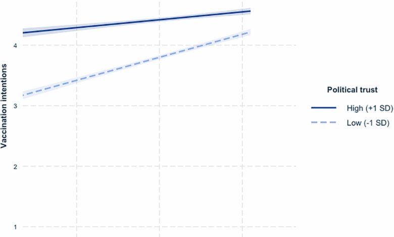 Intenções de vacinação em função da preocupação e confiança política (pontuações mais altas representam maiores intenções de vacinação) no Estudo 1. Crédito: Psicologia Política (2022). DOI: 10.1111/pops.12871