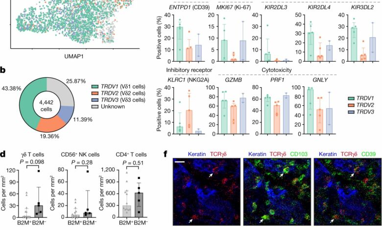 Os subconjuntos de células T infiltrantes de tumor Vδ1 e Vδ3 exibem marcas de atividade citotóxica em cânceres de cólon MMR-d. a, incorporação UMAP mostrando o agrupamento de células T γδ (n = 4.442) isoladas de cânceres de cólon MMR-d (n = 5) analisadas usando scRNA-seq. As cores representam o uso da cadeia TCR Vδ. Os pontos representam células individuais. b, As frequências de uso da cadeia TCR Vδ das células T γδ (n = 4.442) analisadas usando scRNA-seq como uma porcentagem do total de células T γδ. c, As frequências de células positivas para genes selecionados em células Vδ1 (n = 1.927), Vδ2 (n = 860) e Vδ3 (n = 506) como a porcentagem do total de células T γδ de cada tumor de cólon MMR-d (n = 5) analisados usando scRNA-seq. As células Vδ3 estavam presentes em dois dos cinco cânceres de cólon. Os dados são mediana ± IQR, com amostras individuais (pontos). d, As frequências de células T γδ, CD56+ Células NK, CD4+ Células T e CD8+ Células T em B2M virgens de tratamento+ (n = 12) e B2M– (n = 5) cânceres de cólon MMR-d. Os dados são mediana ± IQR, com amostras individuais (pontos). Os valores de P foram calculados usando testes de soma de postos de Wilcoxon de dois lados. e, As frequências de células T γδ positivas para granzima B, CD56+ Células NK, CD4+ Células T e CD8+ Células T em B2M virgens de tratamento– (n = 5) cânceres de cólon MMR-d. CD56+ As células NK estavam presentes em quatro dos cinco B2M– amostras de câncer. Os dados são mediana ± IQR, com amostras individuais (pontos). f, Imagens representativas da detecção de tecido residente (CD103+), ativado (CD39+), citotóxico (granzima B+), proliferando (Ki-67+) e PD-1+ Células T γδ (setas brancas) por análise IMC de um câncer de cólon MMR-d virgem de tratamento com defeitos B2M. Barra de escala, 20 μm. Crédito: Natureza (2023). DOI: 10.1038/s41586-022-05593-1
