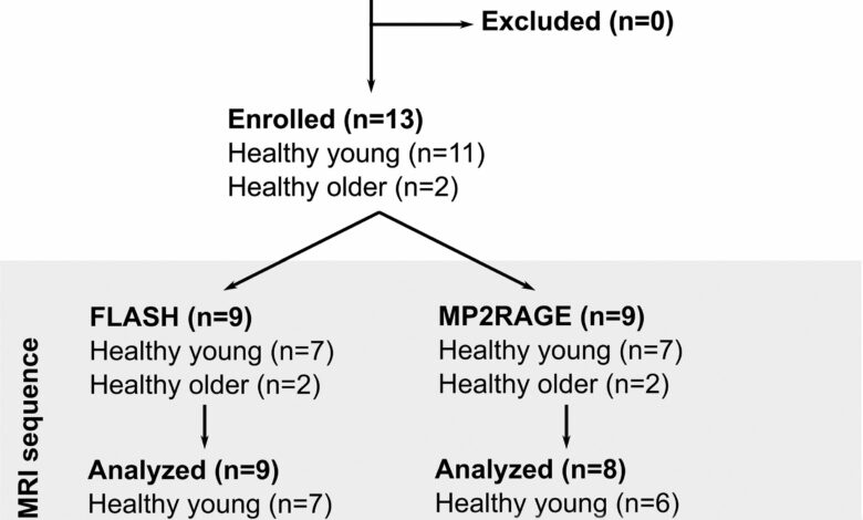 Fluxograma de recrutamento de participantes. FLASH = tiro rápido de baixo ângulo, MP2RAGE = eco de gradiente rápido preparado por magnetização 2. Crédito: Radiologia (2023). DOI: 10.1148/radiol.220989