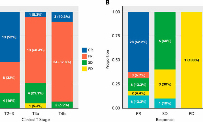 Resposta radiológica, TRG e estágio clínico T. (A) Resposta radiológica entre pacientes com diferentes estágios clínicos T; pacientes com doença cT2–3 eram mais propensos a atingir RC. (B) TRG entre pacientes com diferentes respostas; a maioria dos pacientes com PR atingiu um CR patológico (TRG 0). Abreviações: CR, resposta completa; N/A, TRG não disponível porque a cirurgia não foi realizada ou o tumor era irressecável; DP, doença progressiva; PR, resposta parcial; MS, doença estável; TRG, grau de regressão do tumor. Crédito: Jornal da Rede Nacional Abrangente de Câncer (2023). DOI: 10.6004/jnccn.2022.7060