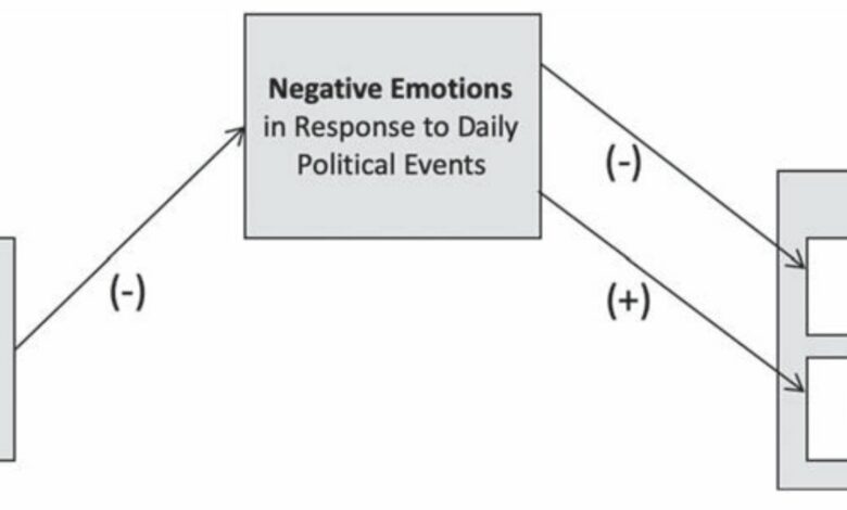 Figura conceitual demonstrando como a regulação emocional pode ser usada para reduzir as emoções negativas em resposta a eventos políticos estressantes, com uma troca resultante entre bem-estar e ação política. Observação. Embora as respostas emocionais negativas à política devam se acumular e promover pior bem-estar, essas emoções também podem impulsionar a ação política. Como tal, a regulação emocional pode vir com um trade-off, pelo qual as pessoas são capazes de proteger seu bem-estar, mas com um custo para a ação política. Crédito: Jornal de Personalidade e Psicologia Social (2023). https://doi.org/10.1037/pspa0000335