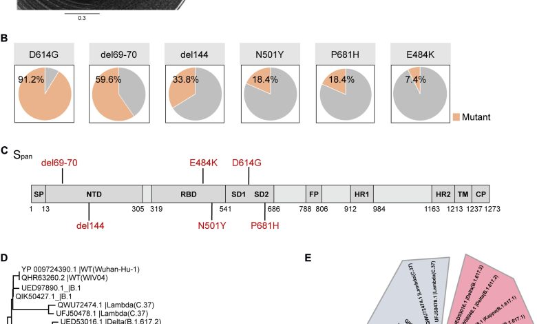 A evolução da proteína SARS-CoV-2 S foi usada para orientar o design do Sfrigideira seqüência.(UMA) Árvores filogenéticas são mostradas para 2675 sequências de aminoácidos da proteína S do banco de dados NCBI. (B) Proporção das cinco principais mutações e a mutação E484K para as sequências de aminoácidos analisadas. (C) Diagrama linear da proteína SARS-CoV-2 S de comprimento total, com Sfrigideira mutações em vermelho. (D e E) A árvore filogenética foi construída usando o método de junção de vizinhos do MEGA 10.0 e exibida em forma de retângulo (D) ou de forma radiada (E). o Sfrigideira antígeno é destacado em vermelho (a linha de Sfrigideira é ampliado 10 vezes para visualização). Crédito: Ciência Medicina Translacional (2023). DOI: 10.1126/scitranslmed.abo3332