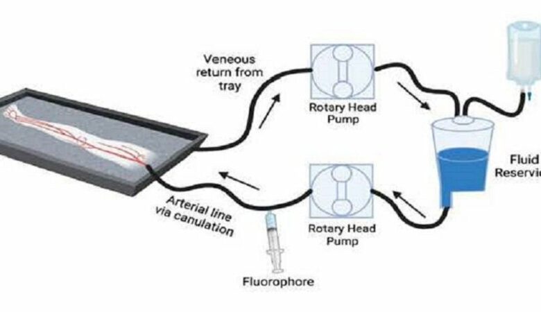 Perfusão de um membro amputado com solução salina e um agente fluorescente (ou seja, fluoróforo) administrado por meio de uma artéria dominante. A solução salina e o fluoróforo direcionado entraram pela artéria, o membro foi drenado por gravidade e o perfusato foi reciclado de volta ao circuito. Crédito: Jornal de Óptica Biomédica (2023). DOI: 10.1117/1.JBO.28.8.082802