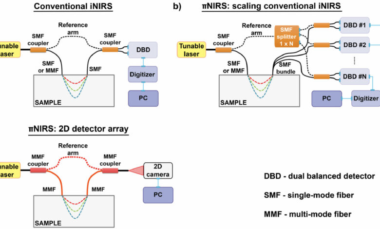Um diagrama esquemático de espectroscopia interferométrica de infravermelho próximo convencional (iNIRS, a) é comparado a duas possíveis implementações de iNIRS paralelo (πNIRS, b, c). Crédito: Óptica Biomédica Express (2022). DOI: 10.1364/BOE.472643