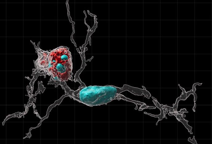 Uma célula imune microglia (branca) que comeu um neurônio (vermelho) no cérebro de uma rata durante o desenvolvimento. Crédito: PNAS https://doi.org/10.1073/pnas.221264612