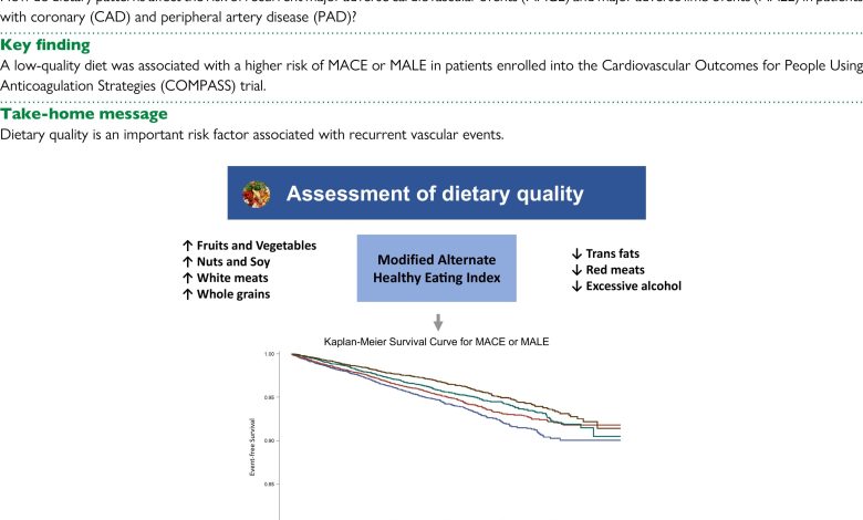 Quando os pacientes foram divididos em quatro grupos de acordo com sua pontuação, aqueles no quartil mais baixo tiveram um risco 27% maior de eventos cardiovasculares e nos membros em comparação com os pacientes no quartil mais alto. Este risco aumentado foi impulsionado principalmente por eventos cardiovasculares naqueles com baixo qualidade da dieta.