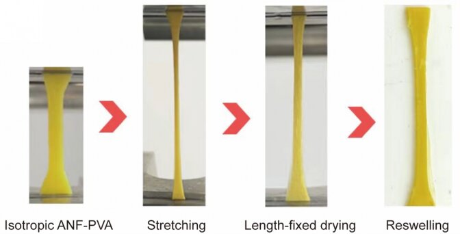Neste estudo, nanofibras de aramida derivadas de Kevlar, um material polimérico usados em coletes à prova de balas e capacetes, foram misturados ao álcool polivinílico, outro polímero sintético, para a construção de hidrogéis miméticos tendinosos. Com o estresse de tração aplicado durante o processo de fabricação, as nanofibras de aramida se alinham umas com as outras de acordo com a direção do alongamento, levando a uma rede anisotrópica que imita as características estruturais dos tendões naturais.