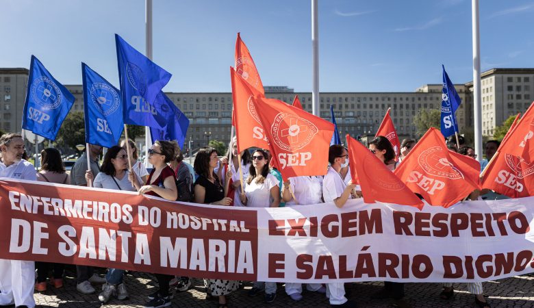 A segurar uma faixa com a inscrição “Enfermeiros do Hospital de Santa Maria exigem respostas e salário digno”, estes profissionais entoavam palavras de ordem como “Ministro escuta, enfermeiros estão em luta”, “Temos formação, exigimos valorização”, enquanto acenavam com bandeira do Sindicato dos Enfermeiros Portugueses (SEP), que convocou a paralisação.