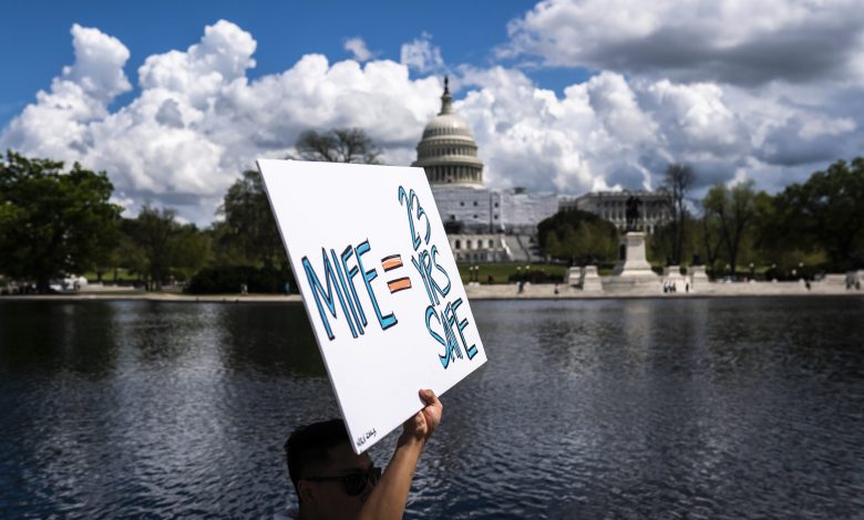 Com o Capitólio dos EUA ao fundo, um manifestante segura uma placa em apoio ao mifepristone ao passar pelo capitólio após uma manifestação da Planned Parenthood em apoio ao acesso ao aborto fora da Suprema Corte no sábado, abril. 15 de janeiro de 2023, em Washington. Crédito: AP Photo/Nathan Howard