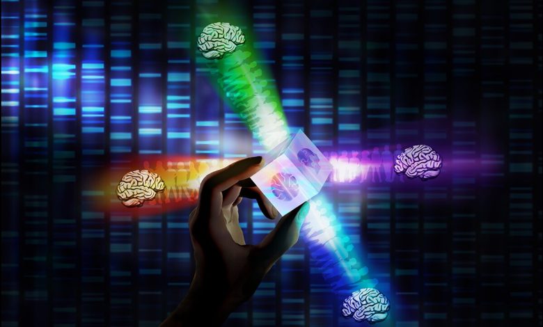O aprendizado de máquina das dimensões do comportamento cerebral revela quatro subtipos de transtorno do espectro do autismo ligados a vias moleculares distintas. Aqui, o cubo de prisma 3D representa o aprendizado de máquina das três dimensões do comportamento do cérebro, gravadas no vidro do prisma. A luz branca ou “dados” passa para o prisma ou “algoritmo de aprendizado de máquina”, dividindo-se em quatro caminhos de luz coloridos que representam o espectro de pessoas autistas nos quatro subtipos de autismo. O fundo pintado de uma matriz de sequenciamento representa as associações moleculares dos subtipos de autismo. Crédito: Weill Cornell Medicine; Dra. Amanda Buch