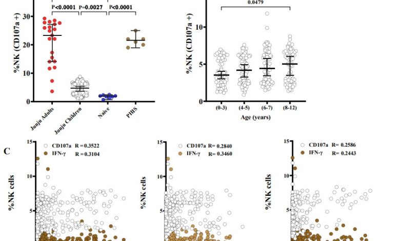 In the controlled human malaria infection part of the study, the team observed that Kenyan adults who didn’t develop fever harbored higher amounts of antibody-dependent natural killer cells than those who needed treatment. The team then examined the 293 samples from children living in Junju and found that antibody-dependent natural killer cells rose with age and spiked during infections with P. falciparum.