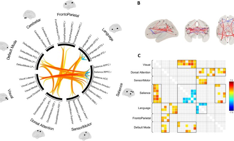 Efeitos do óxido nitroso na conectividade funcional. (A) A visão circular mostra mudanças significativas de conectividade funcional (óxido nitroso versus condição de controle) entre ROIs de sete redes corticais cerebrais e uma rede cerebelar. (B) A visualização do conectoma exibe as ROIs com linhas de conectividade supralimiar individuais entre elas. (C) Representação da matriz de conectividade ROI-to-ROI de óxido nitroso versus condição de controle. Apenas pares significativos de ROI são mostrados na matriz. Crédito: NeuroImagem (2023). DOI: 10.1016/j.neuroimage.2023.120097