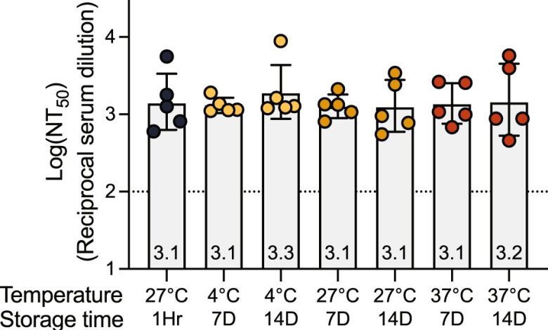 O DCFHP-alume formulado é termoestável até 37 °C por 14 dias. Títulos de neutralização contra o pseudovírus Wuhan-1 SARS-CoV-2 para soro obtido de animais individuais 21 dias após a imunização com DCFHP-alum (10 µg DCFHP com 150 µg alume) que foi armazenado em uma faixa de temperaturas (parte inferior) por 7 dias ou 14 dias, em comparação com DCFHP-alume recém-formulado (à esquerda, círculos pretos). Os limites de quantificação do ensaio são mostrados como uma linha horizontal pontilhada. Um único experimento representativo de amostras executadas em duplicata técnica é mostrado. GMT e STD são mostrados. Crédito: Natureza Comunicações (2023). DOI: 10.1038/s41467-023-37417-9