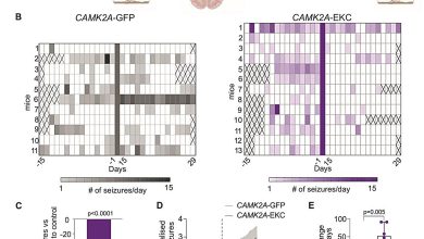 A terapia CAMK2A-EKC reduz a frequência das crises. A. Linha do tempo. B. Mapa de calor exibindo a ocorrência de…