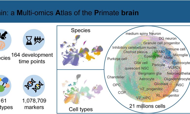 O MAPbrain integra três tipos de dados ômicos de humanos e cinco espécies de primatas não humanos, cobrindo seis espécies no total. Ele contém mais de 21 milhões de células e identifica 161 tipos de células em 38 regiões cerebrais e 436 sub-regiões, abrangendo 164 diferentes momentos de desenvolvimento, de acordo com os pesquisadores.